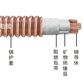 結構 1.電纜導體:有多股銅線絞合而成,具有良好的彎曲特性。2.絕緣層:采用耐高溫,不燃燒的無機礦物絕緣材質。3.銅護套:銅質材料,經特殊加工有良好的彎曲特性,并作為PE線。4.外護層:采用低煙無毒的塑性材質,有良好的防腐蝕特征。